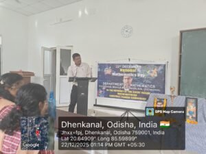 Dhenkanal – Today, 22/12/25 Rikh, National Mathematics Day was celebrated in Dhenkanal Women’s College Campus. On today’s National Mathematics Day, Professor Jai Prakash Panda of Burla VSSUT participated as the chief speaker. He highlighted the various uses of mathematics and the biography of Ramanuja. On today’s day, the welcome speech was given by Shri. Bhubaneswar, Head of the Department of Speech.He looked at the life of Ramanuja with struggles. Dr. Rosalini Das introduced the keynote speaker in today’s meeting. On this occasion, quiz and poster making competition was conducted and the winners were given trophies and certificates. A film made on Ramanuja was presented in today’s seminar. Finally, Dr. Jitendra Kumar Behera proposed the vote of thanks.